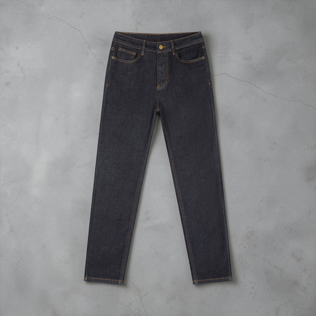 Elevate your foundational wardrobe. The Verona High-Rise Denim redefines the classic slim silhouette through the lens of quiet luxury. Crafted from a premium, structured denim blend, these trousers offer a flawless, waist-defining fit that gracefully elongates the leg. The deep midnight indigo wash, accented by traditional bronze topstitching, creates a highly versatile canvas for any occasion. Transition seamlessly from a crisp poplin blouse and loafers in the morning to an elegant silk top and heels for an evening dinner.